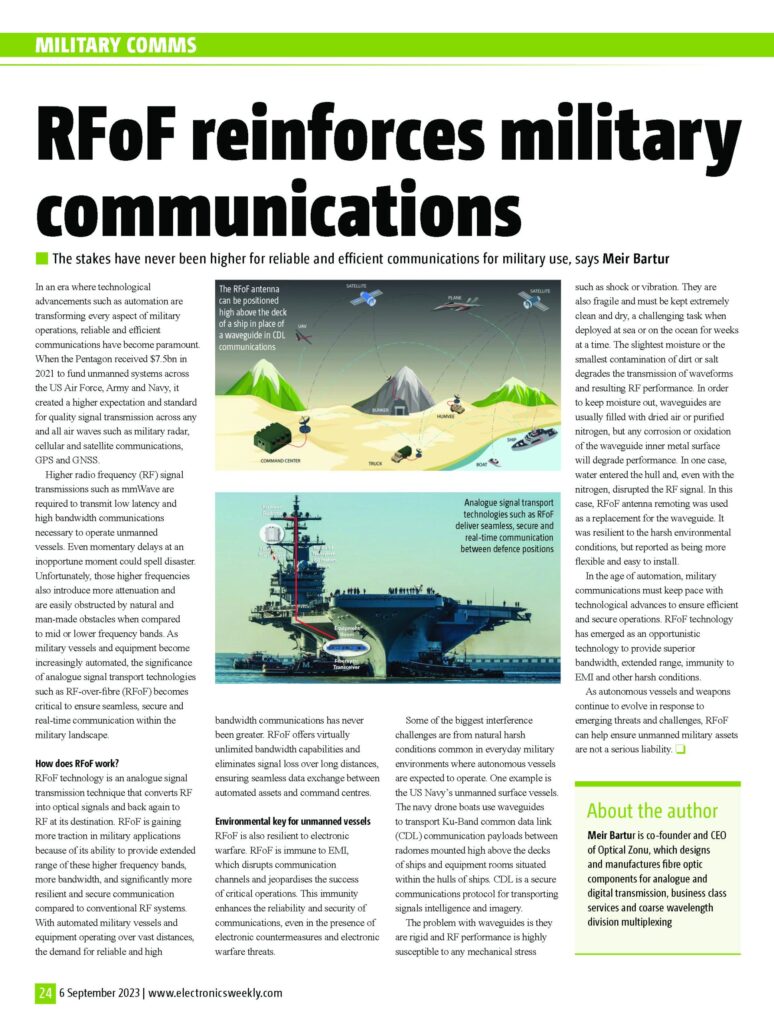 Optical Zonu Corp continues to capture media attention. Not only for our Emcore Relief Program, but for our broad array of RFoF offerings. In the current issue of Electronics Weekly (both in print and electronic) Optical Zonu (OZC) is featured for our military uses. Specifically for our Common Data Link (CDL) and battlefield of the