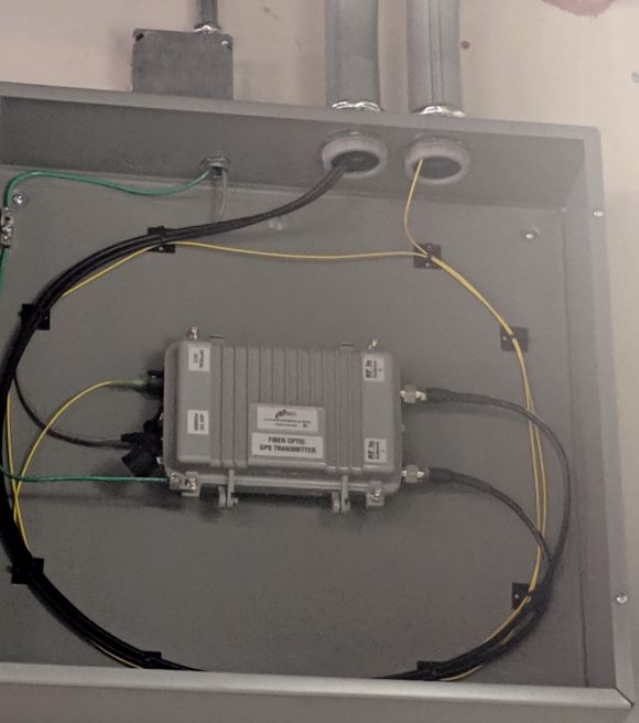 Bradley Terminal was the first project to be completed. The GPS reference for network sync for all the BBUs at Bradley is provided by an Optical Zonu distributed fiber optic connection from two rooftop antennas – one primary and one a hot standby. The single fiber from the two antenna Optical Zonu fiber optic transmitter is routed through a passive, 1 x 8 optical splitter to eight, low profile fiber Base Units, each with eight RF connections to the baseband units.