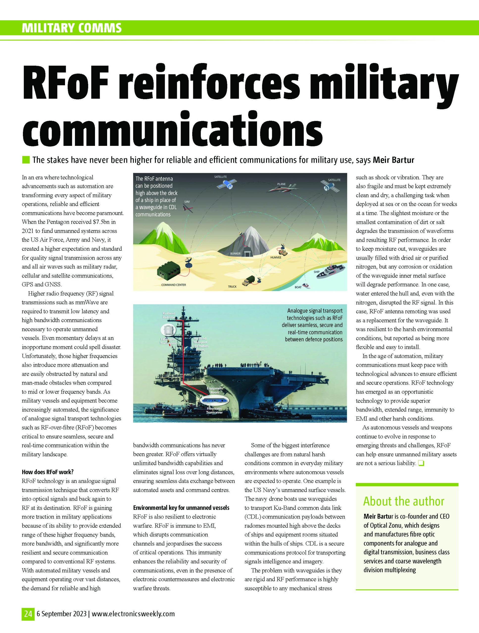 Optical Zonu Corp continues to capture media attention.  Not only for our Emcore Relief Program, but for our broad array of RFoF offerings.  In the current issue of Electronics Weekly (both in print and electronic) Optical Zonu (OZC) is featured for our military uses. Specifically for our Common Data Link (CDL) and battlefield of the future.  As our Co-Founder and CEO Meir Bartur is quoted “The stakes have never been higher for reliable and efficient communications for military use.