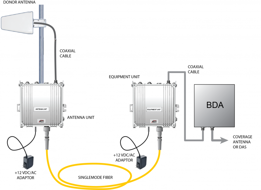 Fiber transmitters feature linear uncooled isolated DFB laser diodes. Receivers feature high performance InGaAs photodiodes. The standard RF interface to the indoor 19” 1RU chassis is 50Ω SMA. The 19” chassis is powered by dual AC or –48 VDC (optional) power supplies. Outdoor equipment as well as the indoor ceiling mount re-radiating termination are powered from +12 VDC.