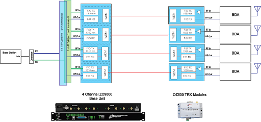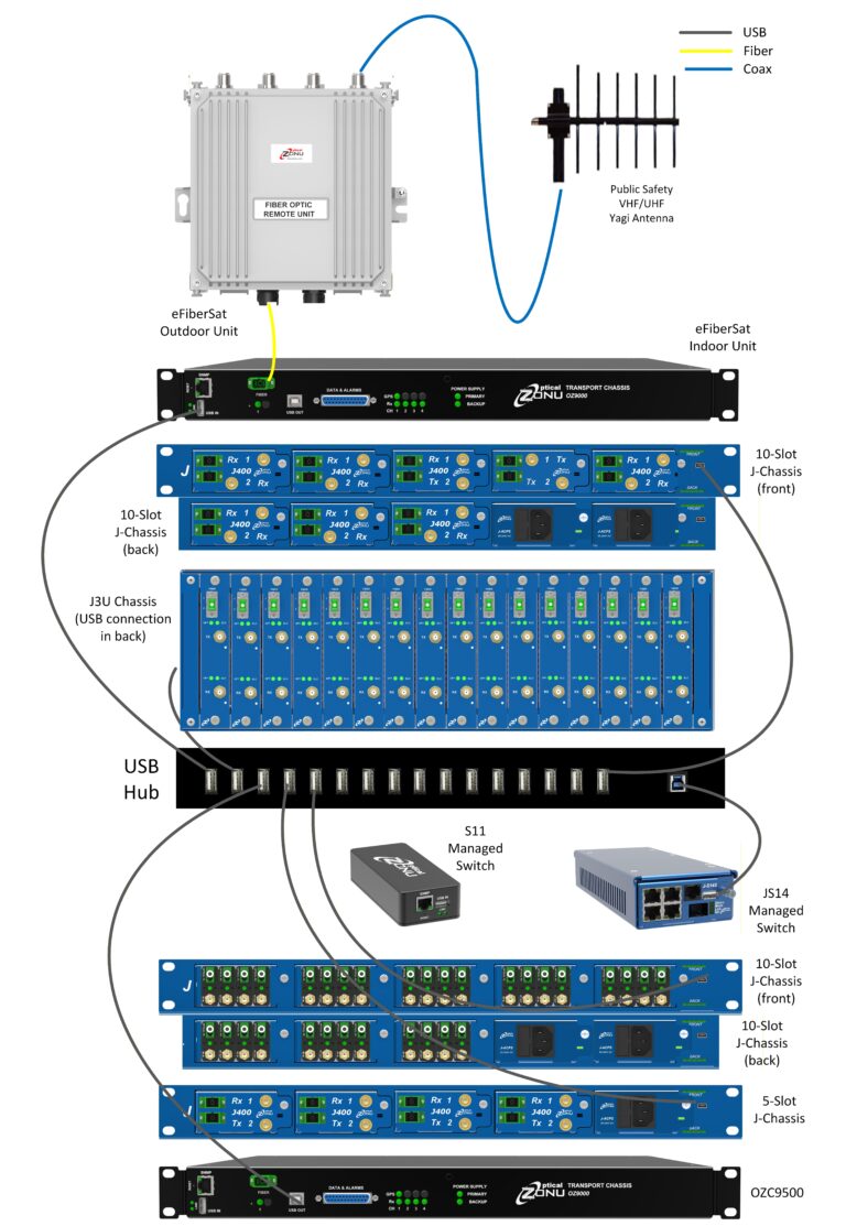 The ZC9500 or J Chassis described above can also be used as a central RF over Fiber hub to simulcast Public Safety RF to multiple remote sites. The OZ600 fiber optic transceiver can be connected to any of the RF boosters from any one of Optical Zonu’s partners, acting as a fiber optic interface that connects to the central hub. When this architecture is applied to simulcasting the macro site, the BDAs indicated would be deployed on multiple towers to guarantee complete coverage. To prevent simulcast interference, the same fiber cable length is used for each site with the excess cable for the shorter runs spooled locally. This ensures that the transit times for the RF signals are identical for each site.with the excess cable for the shorter runs spooled locally. This ensures that the transit times for the RF signals are identical for each site.