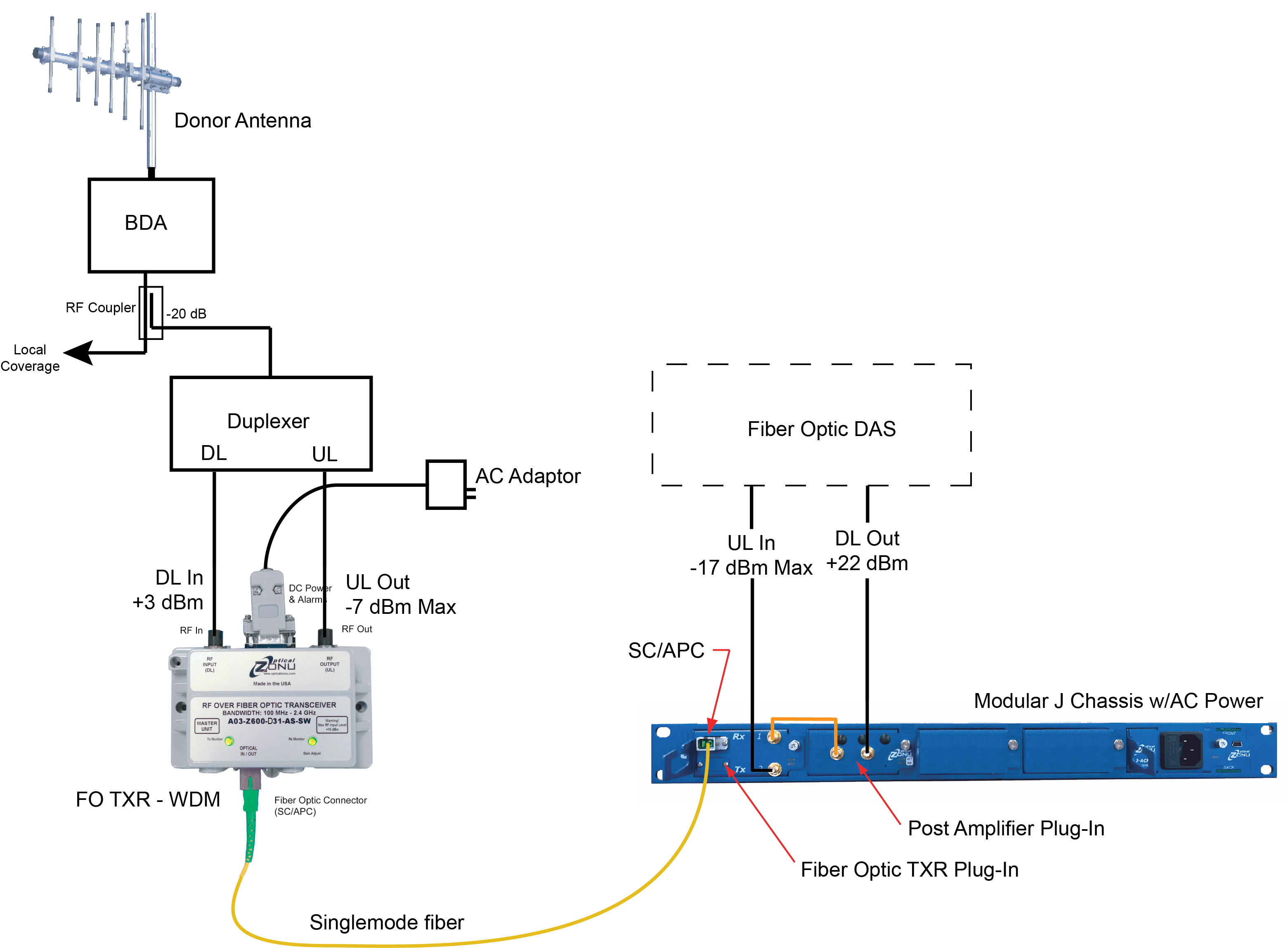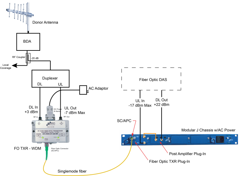 An example of a J Chassis configuration used in conjunction with an OZ600 transceiver is shown in the drawing. Here, the duplexed coverage signal from the BDA is tapped and split into uplink and downlink paths for connection to the OZ600 module. At the DAS headend, the fiber optic transceiver plug-in converts the signal to RF. The downlink signal is routed to an amplifier plug-in to boost the signal to a level suitable for the DAS.